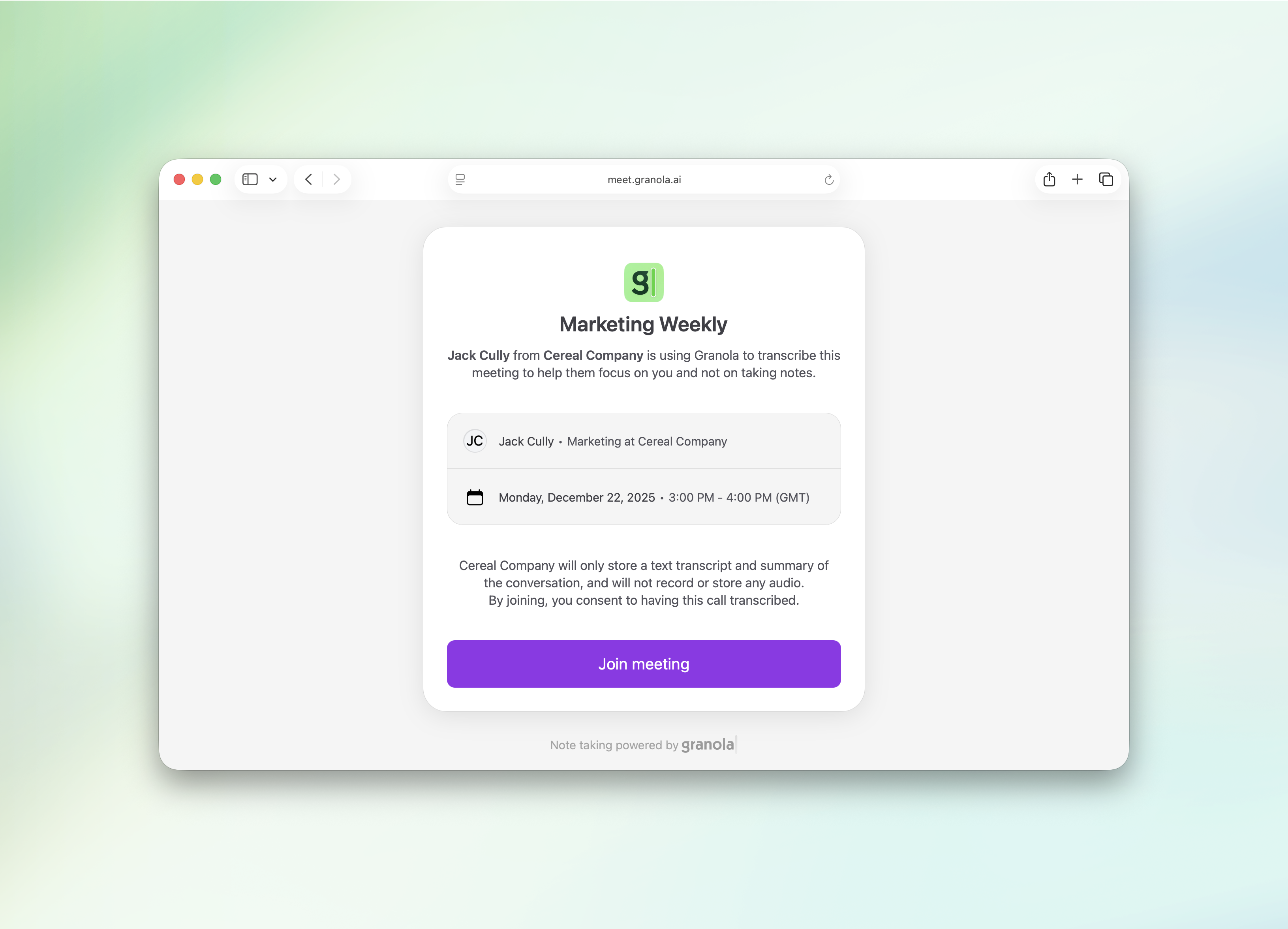 It's an easy way to make sure you've told people that you're using Granola. If you use our Google Calendar add-on when scheduling a meeting, all participants will have to click through a new "Heads up I'm using Granola" screen before they join the meeting.