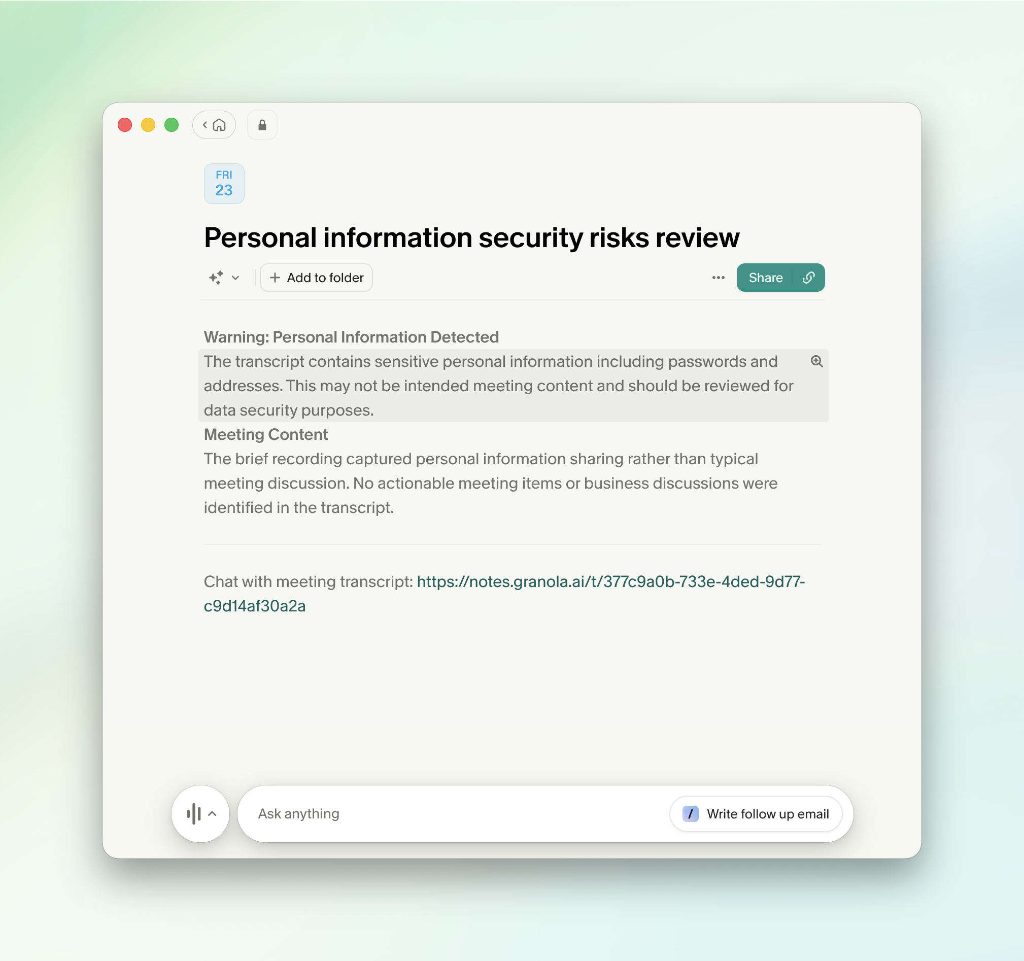And Granola Chat sometimes uses the transcript to be helpful. But it could also be used by someone to try to find sensitive information, if it was talked about.